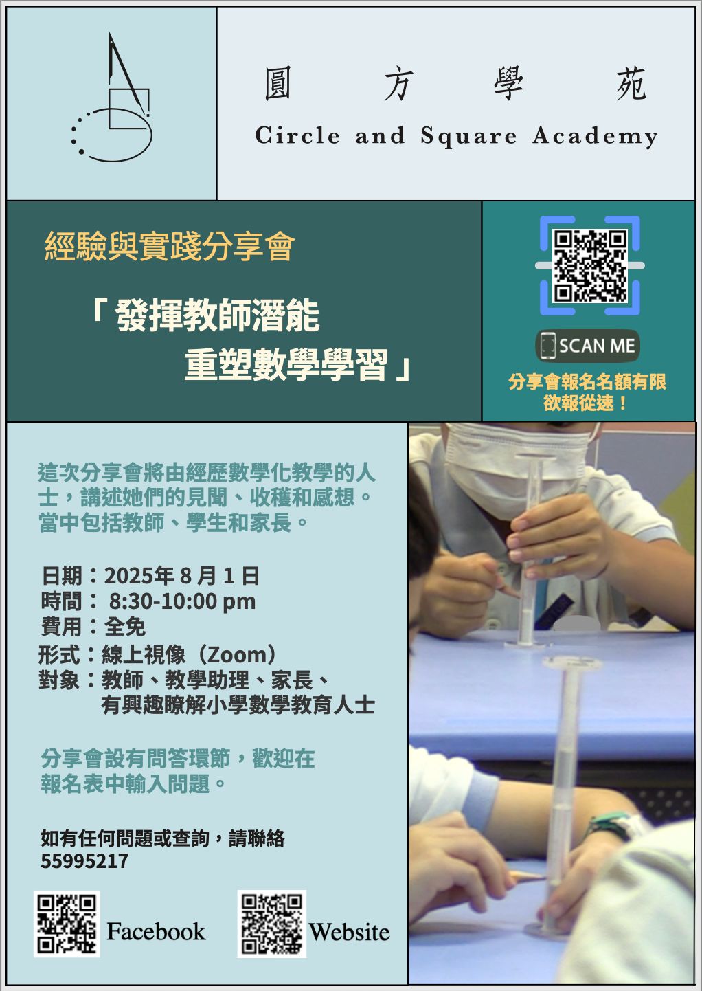 嚟緊8月1日嘅線上分享會,由教師、學生和家長分享經歷數學化教學的見聞、收穫和感想。分享會上會同大家分享一啲數學教學問題,同時為大家解答疑難,記得唔好錯過啦!